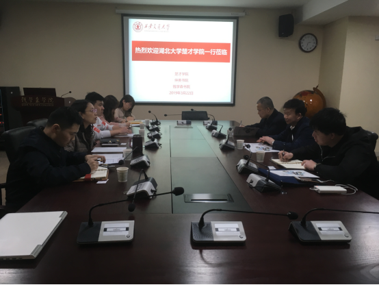 湖北大学楚才学院党委书记王新远介绍了楚才学院的规模、发展现状以及学生培养方式,他提到学院实行一人一导师、一人一计划,针对每一个学生实行定制化培养方案。他对我校书院制育人模式表示了极大的肯定,双方就书院制工作开展以及具体的学生管理问题进行了交流和探讨。