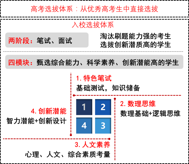 两阶段四模块甄选模式。遵循“兴趣使然、学业优秀、心理健康、体能达标”的德智体综合评价体系,试验班选拔分为笔试、面试两个阶段和特色笔试、数理思维、人文素养、创新潜能四个模块。笔试和面试主要考查学生的基础能力、心理素质、应变能力、科学素养和创新潜能。通过四个模块的内容考核,重点选拔综合能力强、科研兴趣浓、学习天赋高、创新潜质优的学生。