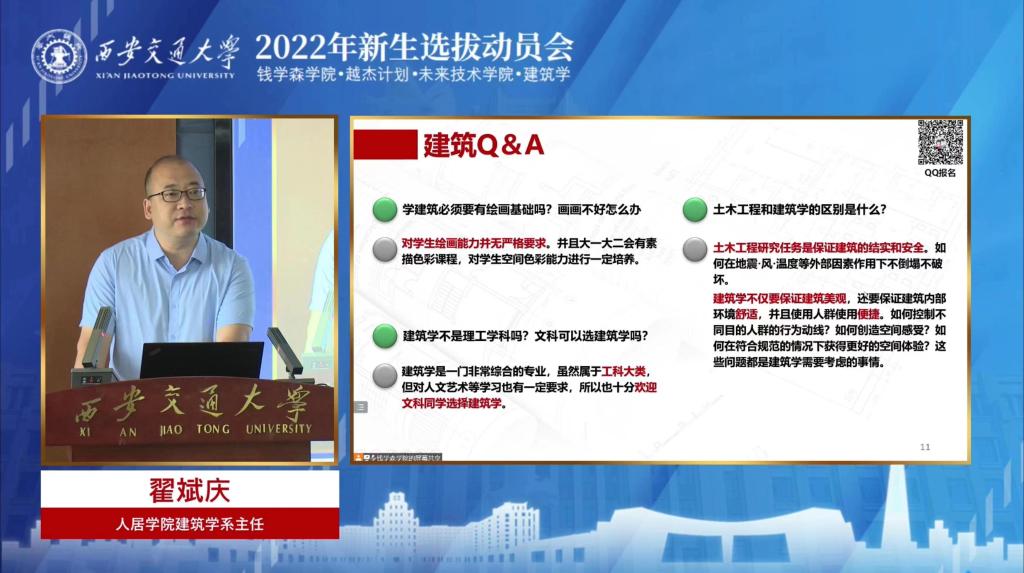 “艺工结合,美好人居。”建筑学系教授翟斌庆从专业概况、学习生活、国际交流等三个方面介绍了建筑学专业的基本情况,同时就学生关注的热点问题进行了解答。他提到,西安交通大学建筑学专业创办于1986年,三十余年来,逐渐形成了学科交叉特色、建筑设计突出的全链条过程学习体系,突出对“研究性”设计能力培养,为国家和社会贡献了大批优秀的建筑行业人才。