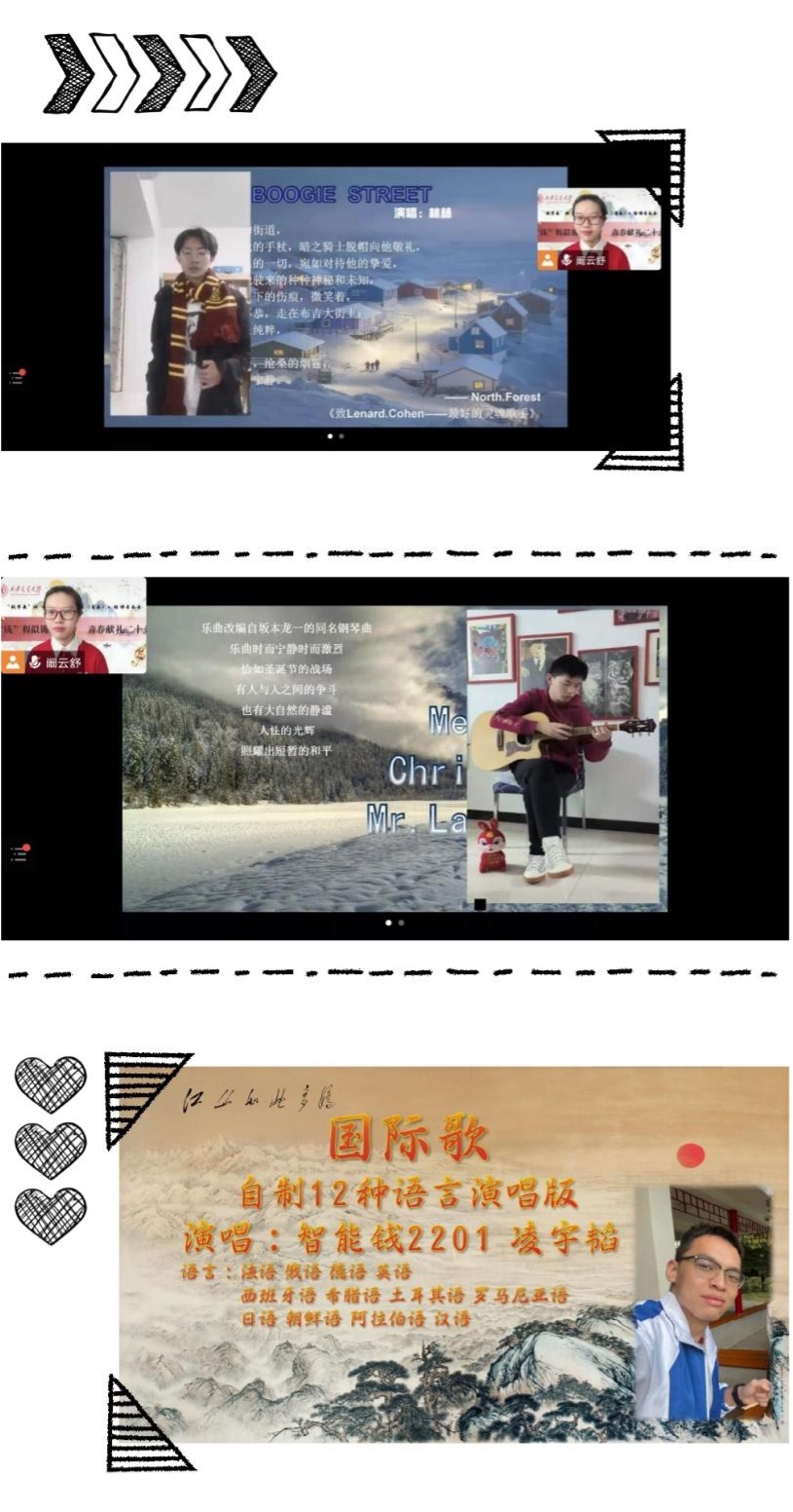 林赫同学以独特的嗓音带来了一首英文歌曲《Boogie Street》,魏子乐同学的精湛的吉他独奏《Merry Christmas Mr.Lawrence》紧随其后,而凌宇韬同学别具一格的用12国语言演唱的《国际歌》掀起了“云”端的第一个小高潮。