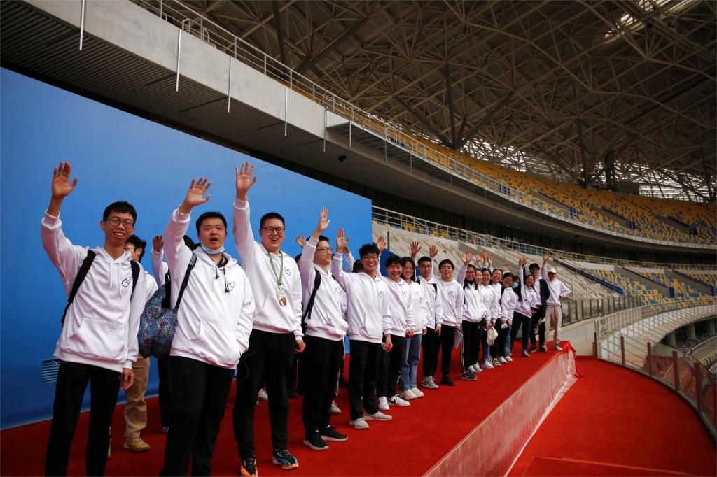 随后,师生们登上场馆的主席台,一览馆内盛大的场面,回顾总书记对于新时代青年的深切嘱托。在此,大家迎风而立面向远方,向未来招手,并通过无人机记录下了这一美好的时刻。