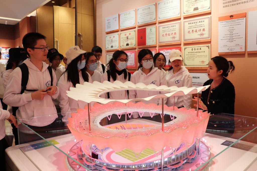 最后一站,越杰学子们来到了第十四届全运会的举办地——西安奥体中心。行走在主场馆的主题展厅里,在工作人员的细致讲解中同学们学习了全运会的发展历程,对全运会的理念、精神、场馆构造都有了深刻理解。