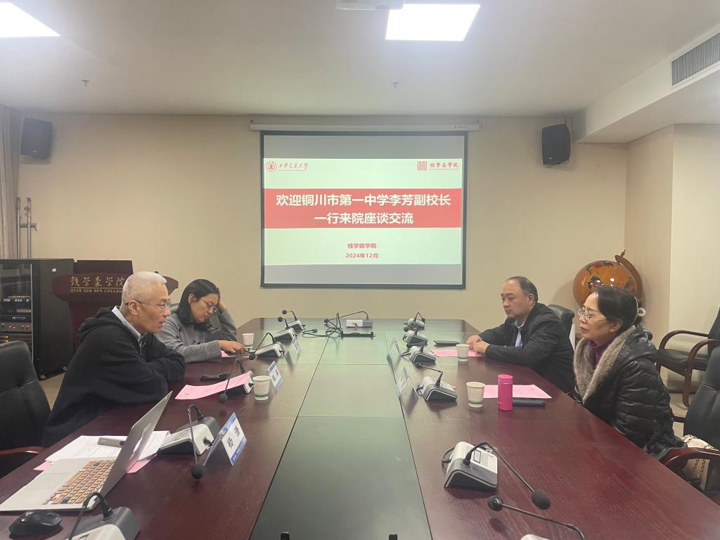 1218日下午,铜川市第一中学李芳副校长、科教处马克副处长一行2人来我院调研。beat365正版唯一官网常务副院长杨森、beat365正版唯一官网副院长王娟等相关负责人员出席座谈。