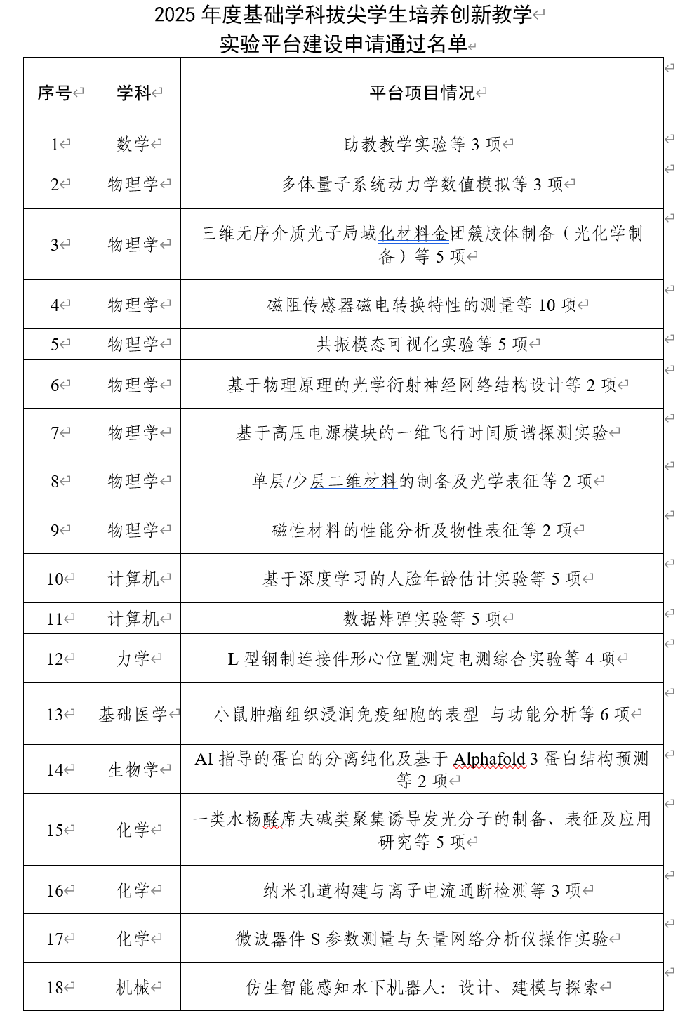 为进一步规范拔尖计划人才培养过程中的设备购置流程,充分发挥好教育教学改革经费的支撑作用,提升各试验班教学和科研训练条件,支持拔尖创新人才培养工作,beat365正版唯一官网开展了2025年度基础学科拔尖学生培养创新教学实验平台建设申请工作。经项目申报,专家评审,最终确定21个平台建设申请通过,现予以公示。