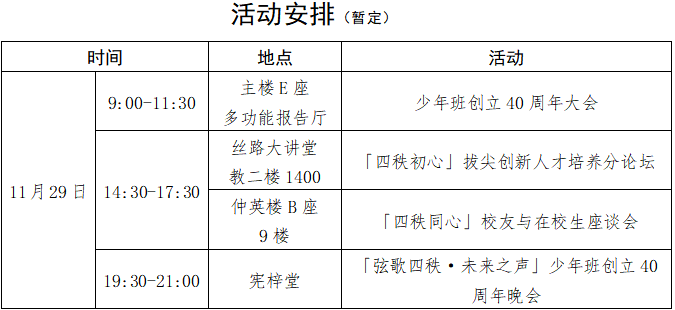 为全方位回溯学校少年班40年来在拔尖创新人才培养道路上的探索足迹,进一步凝聚起“胸怀国之大者、弘扬西迁精神,勇担国家使命、共创交大荣誉”的磅礴奋进力量,学校将于2025年11月29日举办“「从少年,向未来」拔尖创新人才培养高层论坛暨西安交通大学少年班创立40周年大会”。诚邀海内外少年班校友以及长期关心支持少年班发展的各界人士共聚古城西安,共话发展宏图,共叙同窗情谊,携手开启未来崭新篇章!