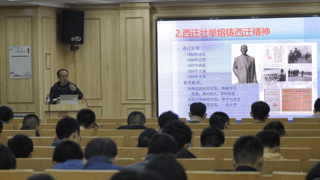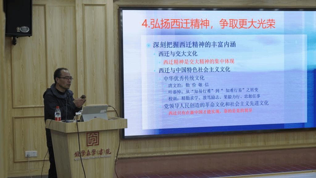 本次党课有四个方面内容:一是交通大学历史脉络分析;二是西迁壮举回顾;三是西迁精神卓然而立;四是如何弘扬西迁精神。