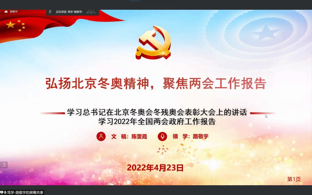 最后,笃学党支部宣传组的路敬宇同志领学了冬奥精神与两会报告。路敬宇同志带领大家回顾了七个方面的政府工作报告内容,九个方面的政府工作任务,以及八个方面的两会精神。同时,路敬宇同志带领参会同志学习了此次北京冬奥会的六个巨大成绩,四个宝贵经验以及五个冬奥精神。北京冬奥会的成功举办再一次向世界人民展示了中国改革开放以来取得的巨大成就,证明了中国特色社会主义道路的正确性。