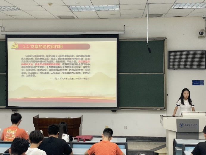 会议第三项,由支部第三党小组的李宛洳同志带领大家学习《中国共产党章程》和《中国共产党普通高等学校基层组织工作条例》。对于《中国共产党章程》,除了讲解《党章》在党内的地位和作用以及条文的主要内容外,她也贴心地就大学生如何学习党章向大家提出了具体的三条建议:阅读《党章》原文、将《党章》与现实实际相结合学习、把《党章》落实到具体行动中。讲解《中国共产党普通高等学校基层组织工作条例》时,她从《条例》的总体框架切入,对《条例》的内容进行了简单概述,并在最后就《条例》的部分重点内容进行了详细地讲解,使大家对于《条例》的意义及主要内容有了更深的理解和体会。
