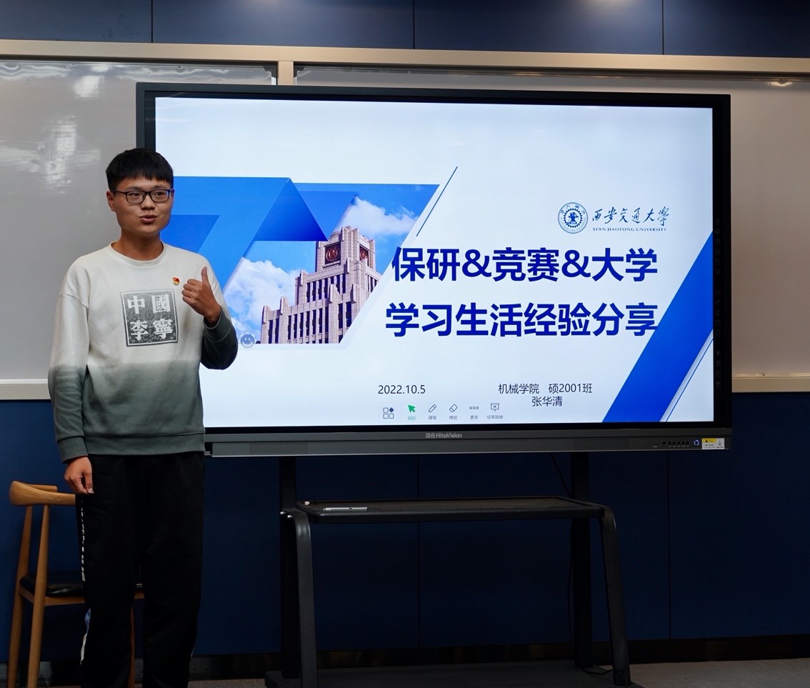 在交流讨论阶段,机械学院硕2001党支部张华清同志就保研竞赛等方面向在座学弟学妹分享交流了大学期间学习生活经验。张华清在分享中建议学弟学妹们在本科期间提早规划、勇于试错,培养“士别三日当刮目相待”的成长型思维,传承弘扬“胸怀大局,无私奉献,弘扬传统,艰苦创业”的西迁精神,做新时代西迁精神新传人。分享结束后,全场报以热烈掌声,张华清还就低年级同志的提问进行了答疑。