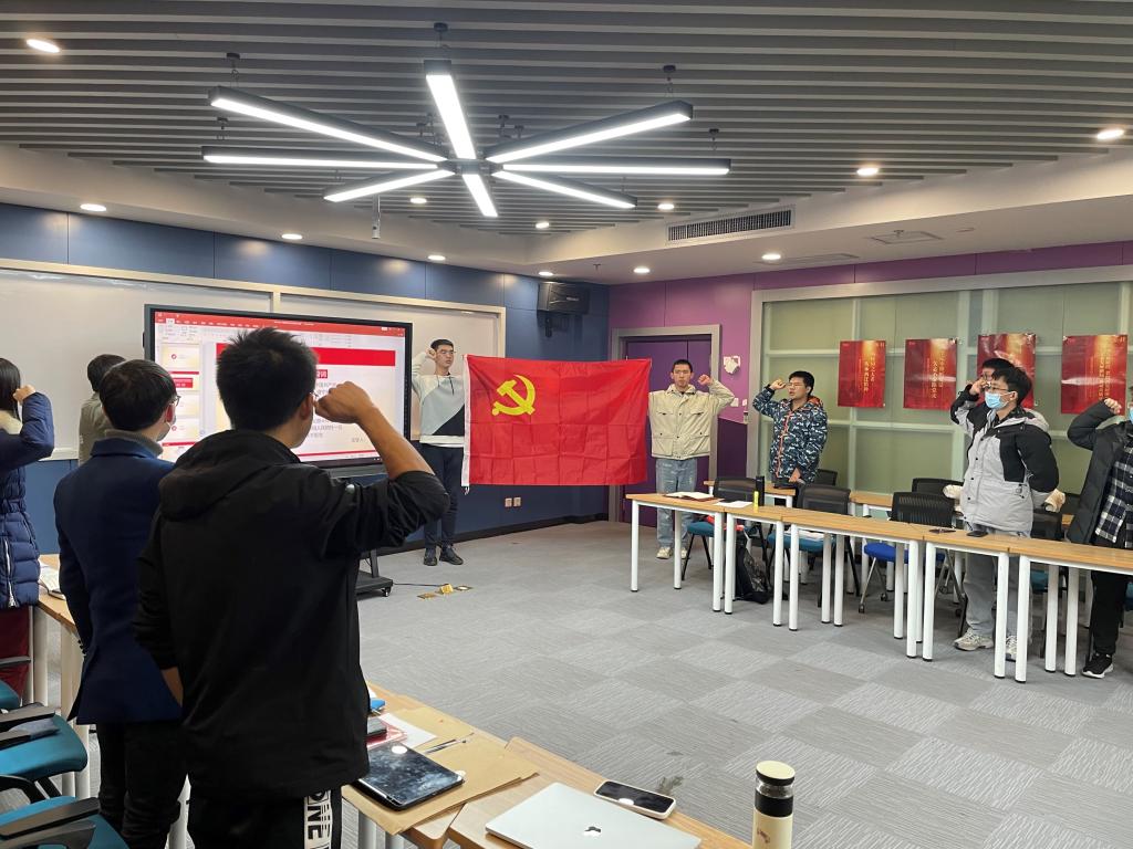 最后,支部向新发展的预备党员同志发放会议记录本、党章和党徽,魏成骁同志带领全体党员同志进行入党宣誓,本次党员大会圆满结束。