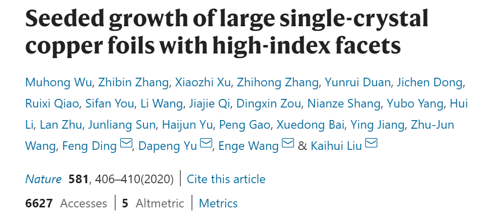 以“Seeded growth of large single-crystal copper foils with high-index facets”为题发表在《自然》上