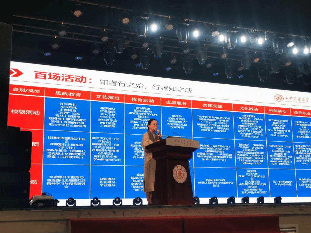 接着,学生处顾蓉老师向同学们介绍了“四个一百”育人方案。“四个一百”即阅读一百本经典、认识一百位老师、听取一百本报告、参加一百场活动,学校以此为抓手,突出价值引导和智慧启发,将文化传承融入育人的全过程,促进学生德智体美劳全面发展。顾老师勉励大一新生积极参与“四个一百”育人行动,享受育人行动为其带来的精神引领,实现素质提升与专业发展。