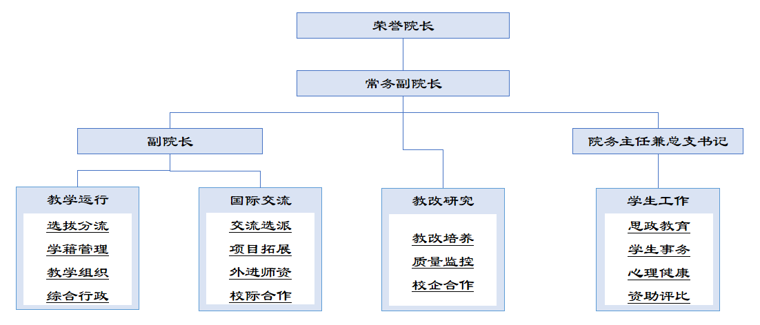 | 院务副主任 | 李华 | 1)协助院务主任工作 2)分管书院学生思想政治、队伍建设工作 3)分管书院一站式、心理、学业学辅、资助、宣传、就业、宿舍文化等专项工作 |