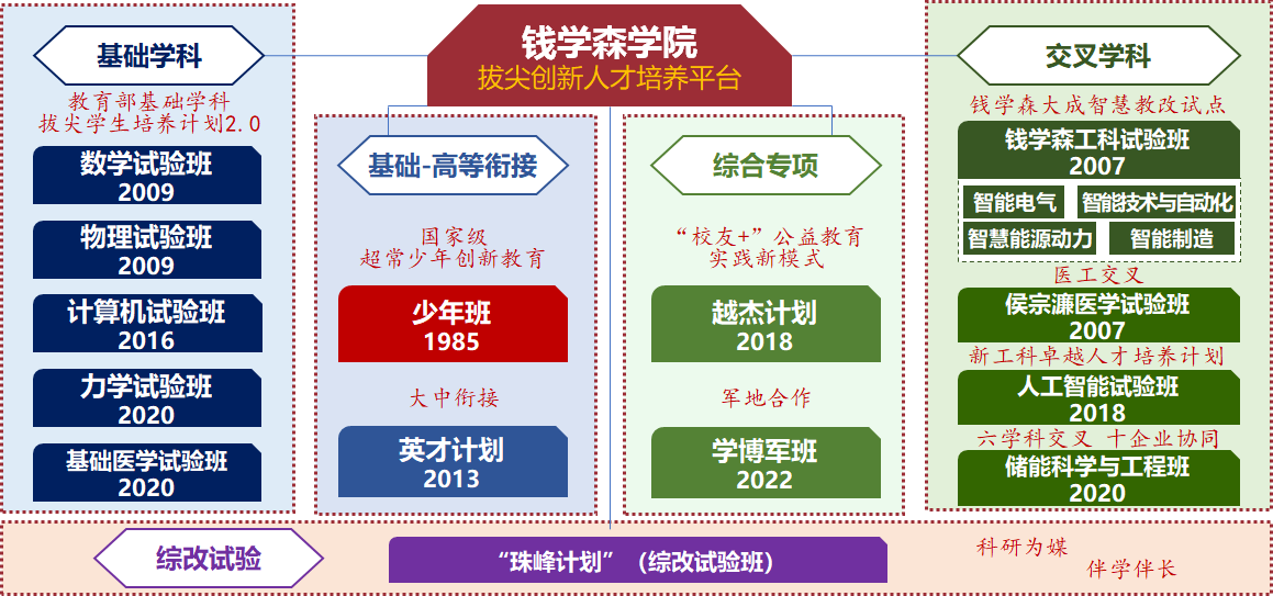 学院矢志于培养模式内涵改革,现已开设17类试验班,每届招生800人左右,专业涵盖理、工、医、交叉学科等。在基础学科领域,入选国家5个基础学科拔尖人才培养基地;在优势工科领域,以钱学森大成智慧教育思想为指导开办工科试验班(钱学森班);在新医科领域,推动侯宗濂医学试验班创新试点;在交叉学科领域,创办人工智能试验班”“储能科学与工程班(储能班)等。在模式创新方面,推动少年班基础高等教育衔接不断深化,创设越杰计划采取校友+公益育人方式等。2022年,西安交通大学与空军军医大学联合培养学博军项目纳入beat365正版唯一官网管理。2024年,创设珠峰计划(综改试验班),以前沿重大科研选题为牵引,鼓励学生自由探索、十年磨一剑,探索以大师引领、优中拔尖、一生一策、科研为媒为特色的拔尖创新人才培养新范式。